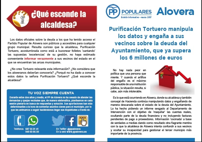 Jueves, 16 de marzo de 2017.- Lo ha vuelto a hacer. La alcaldesa de Alovera, Purificación Tortuero, reincide en los engaños con los que desde el inicio de su mandato intenta confundir a sus vecinos y enmascarar su nefasta forma de gobernar. “No hay nada peor en política que una persona que miente. Y cuando el artífice del engaño es el responsable de una institución pública la situación resulta, si cabe, aún más intolerable. Es lo que está ocurriendo en Alovera, donde su alcaldesa y también concejal de Hacienda continúa manipulando datos y engañando de manera descarada a la ciudadanía sobre el estado de la deuda del Ayuntamiento”, sentencian tajantes los responsables del Partido Popular aloverano, que han editado un boletín informativo para ‘poner luz y taquígrafos’ sobre la verdadera situación en la que se encuentran las arcas municipales.